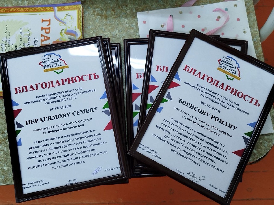 Молодые депутаты Тихорецкого района Юлия Мартынюк и Екатерина Епиченко вручили благодарности от Совета молодых депутатов муниципалитета местным активистам, проявляющим инициативу и принимающим участие в волонтерской деятельности, школьной и станичной жизни.