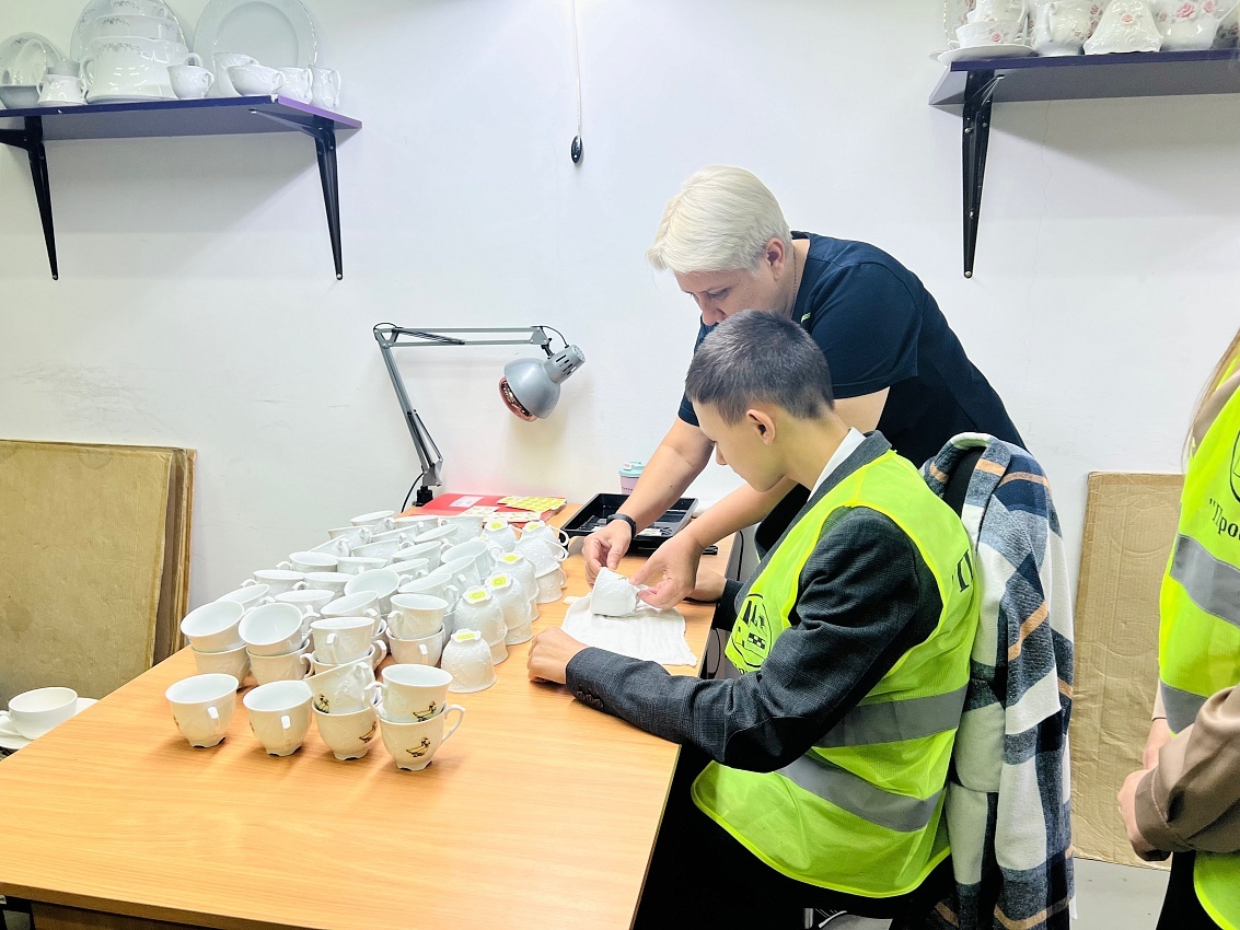 Ребята посетили цеха, где художники-декораторы раскрыли им секреты мастерства выпускаемой продукции, и даже сами попробовали сделать на ней декор.
